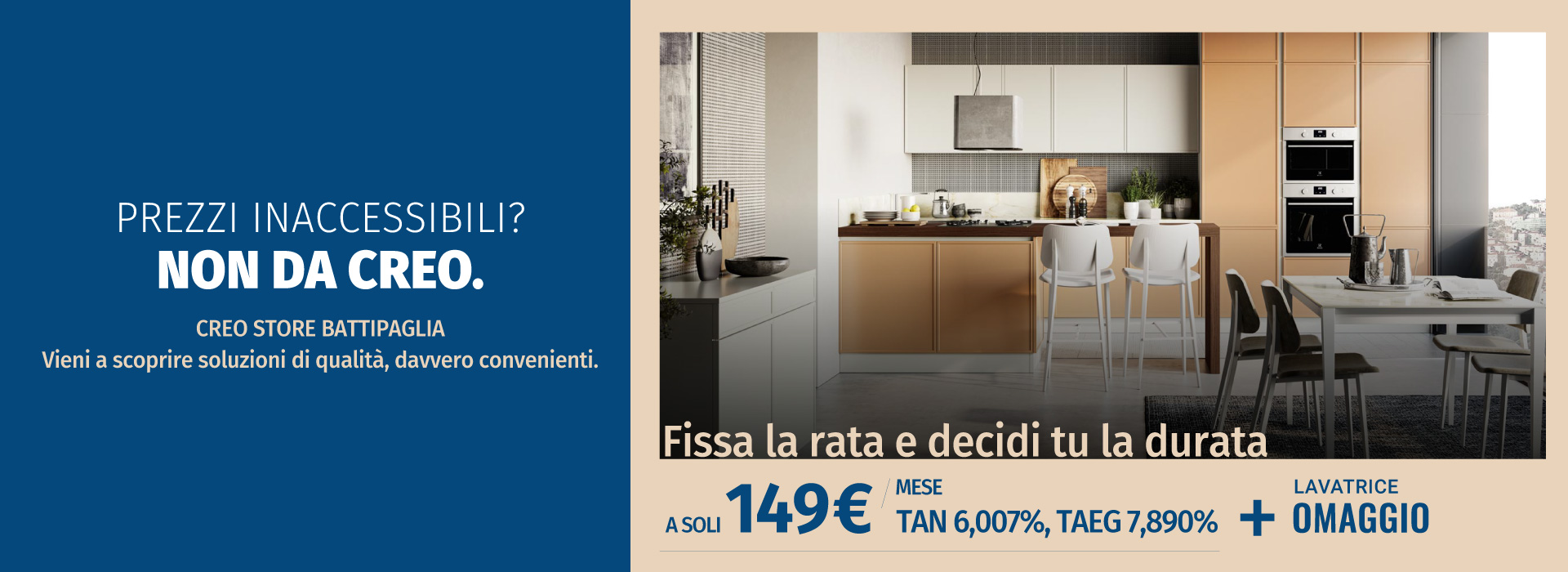 Dal 23 Febbraio al 7 Marzo puoi avere una cucina Creo a partire da 149€ al mese sfruttando le condizioni più vantaggiose. Scegli tu la rata e la durata del finanziamento e in più hai una lavatrice in omaggio.